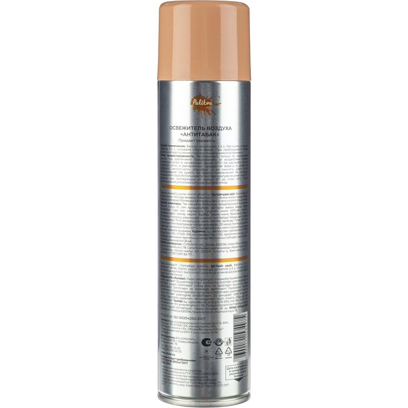 Освежитель воздуха Palitra Антитабак 300 млНазначение/особенности: аэрозольный освежитель воздуха устраняет неприятные запахи и освежает воздух.Способ применения: баллон встряхнуть 2–5 с. Распылять в разные стороны в течение 2–3 с, направив струю вверх. При необходимости более длительного распыления упаковку периодически встряхивать. Меры предосторожности: использовать только по назначению! Баллон под давлением! Предохранять от воздействия прямых солнечных лучей и нагревания выше 40°C! Не распылять вблизи открытого огня и раскаленных предметов! Беречь от детей! Не нарушать целостность упаковки и не сжигать даже после использования! Не курить во время применения! Не допускать попадания в глаза! Использовать при температуре не ниже плюс 10°C. Хранить при температуре от минус 20 до плюс 40°С. После использования утилизировать как бытовой отход. ТУ 20.41.41-122-00204292-2017 Состав: вода, углеводородный пропеллент 15–30%, отдушка < 5%, НПАВ < 5%, консерванты < 5%, пропиленгликоль < 5%.Объем баллона 405 куб.см. Номинальная масса 200 г.Срок годности: 36 месяцев, дата изготовления и номер партии указаны на дне баллона.