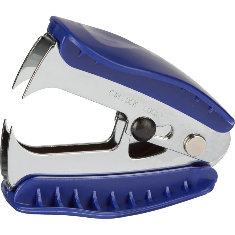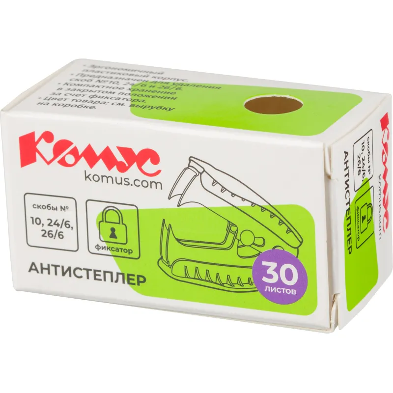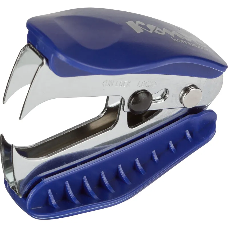 Антистеплер Комус предназначен для удаления скоб № 10, № 24/6 и № 26/6. Рабочий механизм антистеплера выполнен из высокопрочной стали, корпус — из высококачественного синего пластика, следы износа которого не будут заметны даже спустя многократное использование.Позволяет разжать закрепленные скобы более качественно, не нанося повреждений ни материалу, ни кончикам пальцев. Наличие фиксатора обеспечивает удобное хранение в закрытом положении. Размер изделия: 57.5×47 мм. Товар упакован в индивидуальную картонную коробочку.