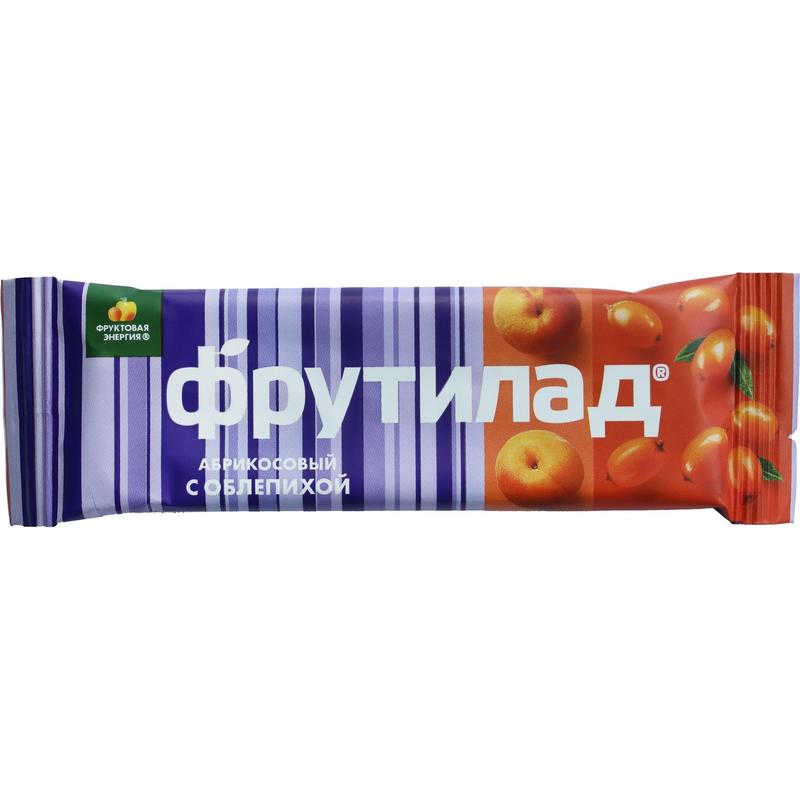 Фруктовый батончик неглазированный «Фрутилад с облепихой». Натуральный фруктовый батончик на основе кураги с добавлением облепихи. • Без консервантов;• Без ароматизаторов;• На фруктозе;• Высокое содержание калия;• Высокое содержание пищевых волокон. Фрутилад — батончик для тех, у кого каждая минута на счету. В машине, на улице, в офисе, на учебе — фруктовый батончик удобно есть в любом месте! Состав: абрикос сушеный (абрикос сушеный, антиокислитель диоксид серы), яблочное пюре натуральное, яблоко сушеное, сок облепихи свежемороженой, фруктоза, стабилизатор гуммиарабик. Пищевая ценность: белки — 2,5 г, жиры — 1 г, углеводы — 72 г. Энергетическая ценность на 100 г: 310 ккал. Срок годности: 12 месяцев. Хранить в сухом месте при температуре от 5°С до 25°С и относительной влажности воздуха не более 75%.Вес: 900 г. Страна производства: Россия.