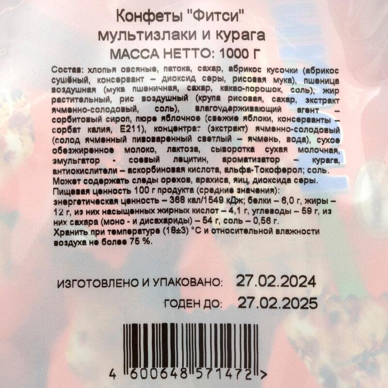 Состав: хлопья овсяные, патока, абрикос кусочки (абрикос сушеный, консервант — диоксид серы, рисовая мука), пшеница воздушная (мука пшеничная, сахар, какао- порошок, соль), рис воздушный (крупа рисовая, сахар, экстракт ячменно- солодовый, соль), сахар, влагоудерживающий агент — сорбитовый сироп, пюре яблочное натуральное, жир кондитерский (рафинированное дезодорированное растительное масло, антиокислитель — альфа-Токоферол), концентрат (экстракт) ячменно-солодовый (солод ячменный пивоваренный светлый — ячмень, вода), сухое обезжиренное молоко, эмульгатор — соевый лецитин, ароматизатор, соль, антиокислитель — аскорбиновая кислота.