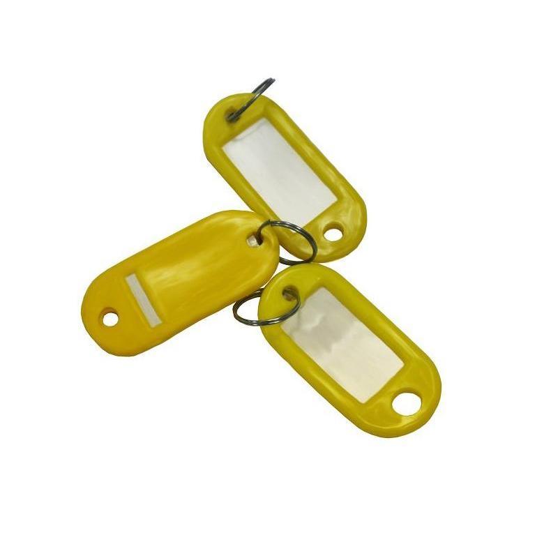 Бирки для ключей изготовлены из пластика жёлтого цвета. Поставляются комплектом по 10 бирок в упаковке. Каждая бирка для ключей снабжена металлическим кольцом. Внутри бирки есть белый бумажный вкладыш, защищённый слоем пластика от повреждения и намокания. На вкладыш можно нанести надпись.