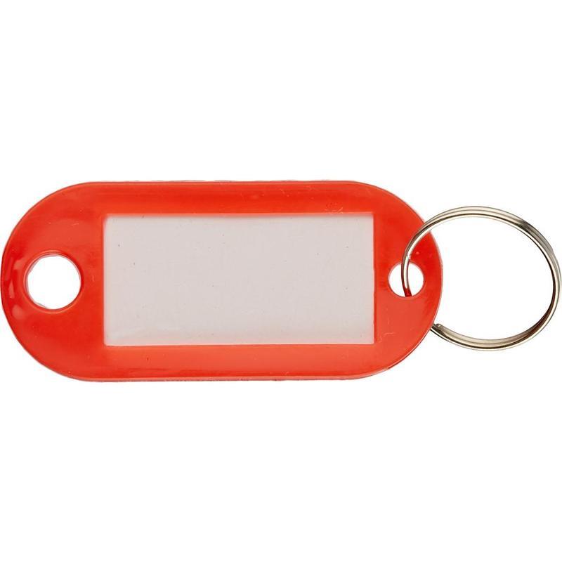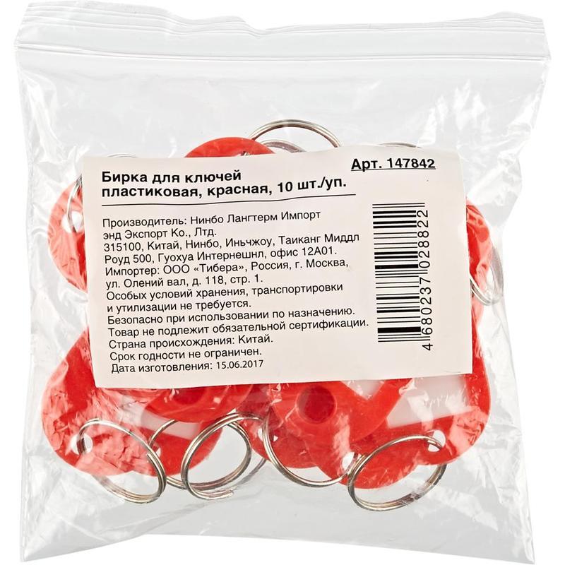Бирки для ключей изготовлены из пластика красного цвета. Поставляются комплектом по 10 бирок в упаковке. Каждая бирка для ключей снабжена металлическим кольцом. Внутри окошка размером 2,6×1,6 см есть белый бумажный вкладыш, защищенный слоем пластика от повреждения и намокания. На вкладыш можно нанести надпись.