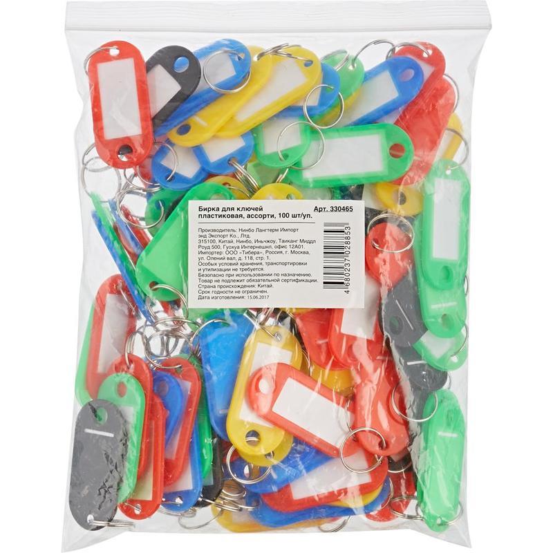 Пластиковая бирка для ключей с металлическим колечком. Бумажная этикетка, зафиксированная в рамке, защищена прозрачной пластиковой пленкой. В полиэтиленовой упаковке с замком (Zip-Lock) - 100 бирок разных цветов. Размер текстового поля 28х14 мм, размер бирки 48х22 мм.