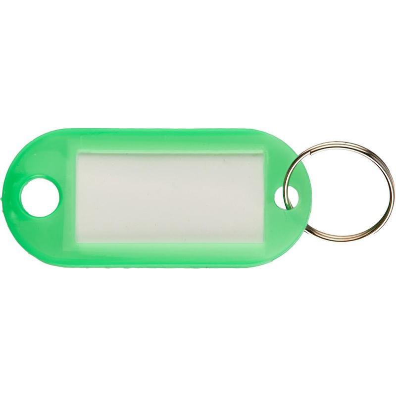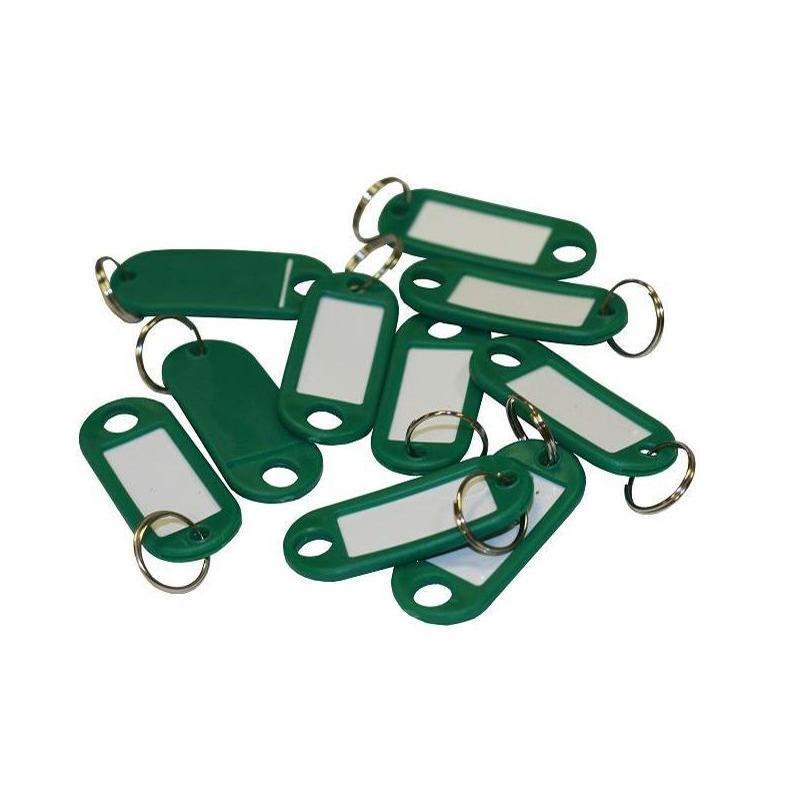 Бирки для ключей изготовлены из пластика зеленого цвета. Поставляются комплектом по 10 бирок в упаковке. Каждая бирка для ключей снабжена металлическим кольцом. Внутри бирки есть белый бумажный вкладыш, защищённый слоем пластика от повреждения и намокания. На вкладыш можно нанести надпись. Размер бирки 5 x2 см, размер окошка 3x1,5 см
