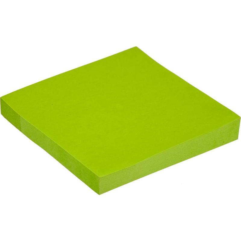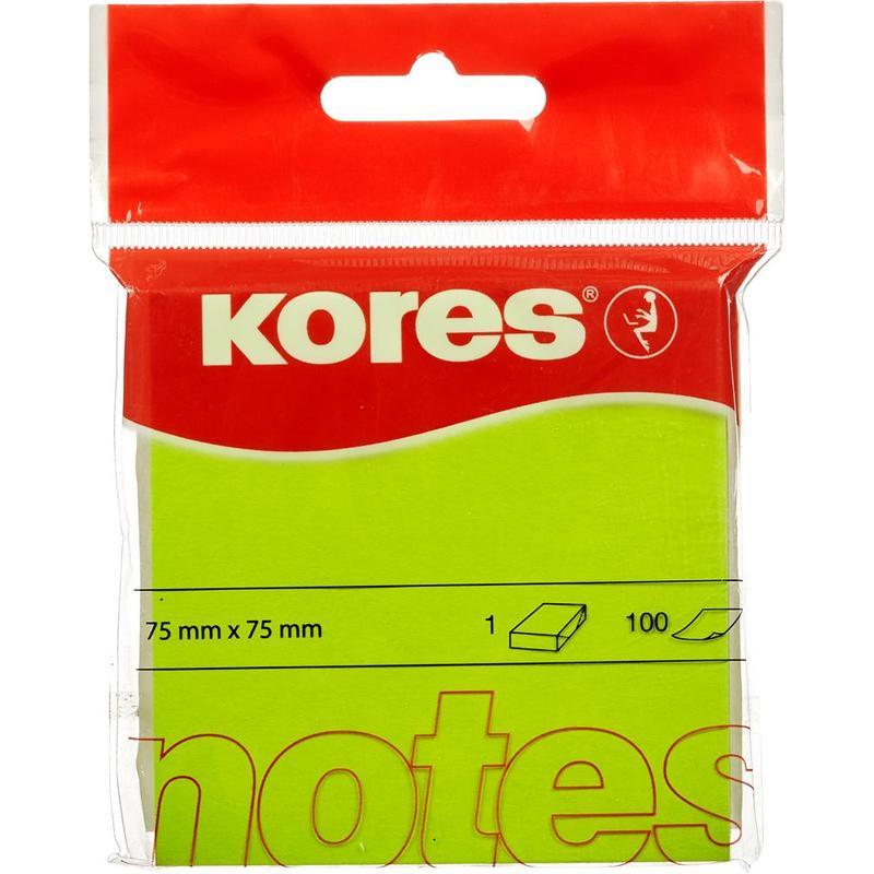 Бумага для заметок с клейким краем Kores. Размер — 75×75 мм, неоновая, зеленого цвета. Плотность бумаги составляет 75 г/кв.м, клейкий слой — 20 Н/м. В упаковке 100 листов. После удаления бумаги на поверхности не остается следов клеевого состава, лист можно крепить повторно.