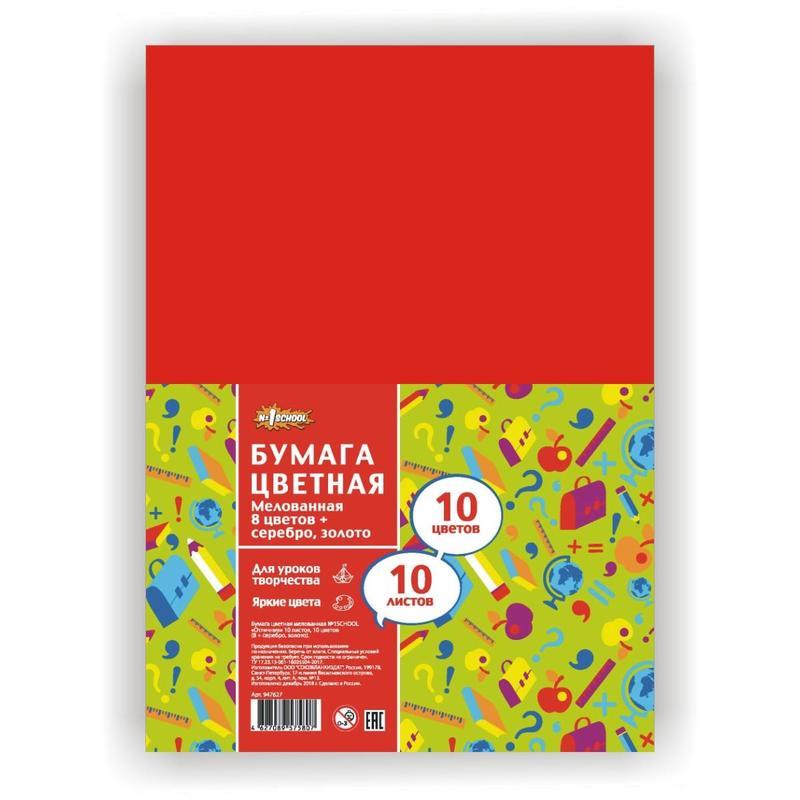 Набор мелованной (10 цветов на 10 листах) цветной бумаги подходит для создания аппликаций, изготовления поделок. Работа с цветной бумагой способствует развитию мелкой моторики у детей. В наборе листы размером 203x283 мм, плотность — 90 г/кв.м. Набор упакован в папку из картона. Цвета в наборе: желтый, золото, серебро, зеленый, коричневый, красный, малиновый, оранжевый, синий, черный.