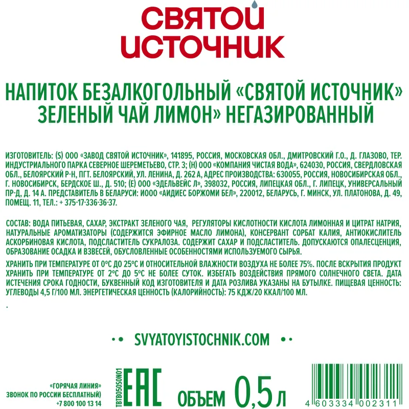 Чай холодный зеленый Святой Источник лимон 0.5 л. Холодный чай Зеленый Лимон от бренда Святой Источник представляет собой идеальное слияние насыщенного вкуса зеленого чая и свежести лимона. Этот негазированный напиток создан для тех, кто ценит качество и вкус в каждом глотке. С каждым глотком вы наслаждаетесь не только приятным ароматом, но и питательной ценностью. Состав напитка делает его идеальным выбором для тех, кто следит за своим здоровьем и фигурой. Энергетическая ценность чая позволяет наслаждаться вкусом без лишних калорий.