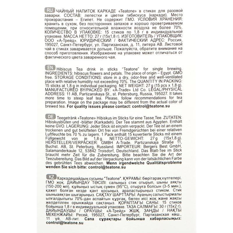 Каркаде — восточный чай с тысячелетней историей, получивший статус напитка фараонов за благородный рубиновый оттенок, легкую освежающую кислинку и терпкий вкус суданской розы. Каркаде подается как горячим, так и холодным. Благодаря вакуумной упаковке каждого стика при извлечении не оставляет капель и брызг. В картонной коробке 15 пакетиков. Вес 65 г.Срок годности: 2 года.Условия хранения: в сухом, без посторонних запахов месте, при относительной влажности воздуха не более 75%.Производитель: «А-Трейд».Страна производства: Россия.
