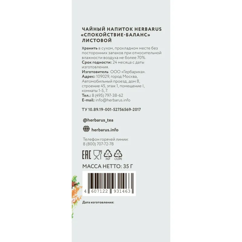 Чайный напиток травяной Herbarus Спокойствие баланс 35 г.