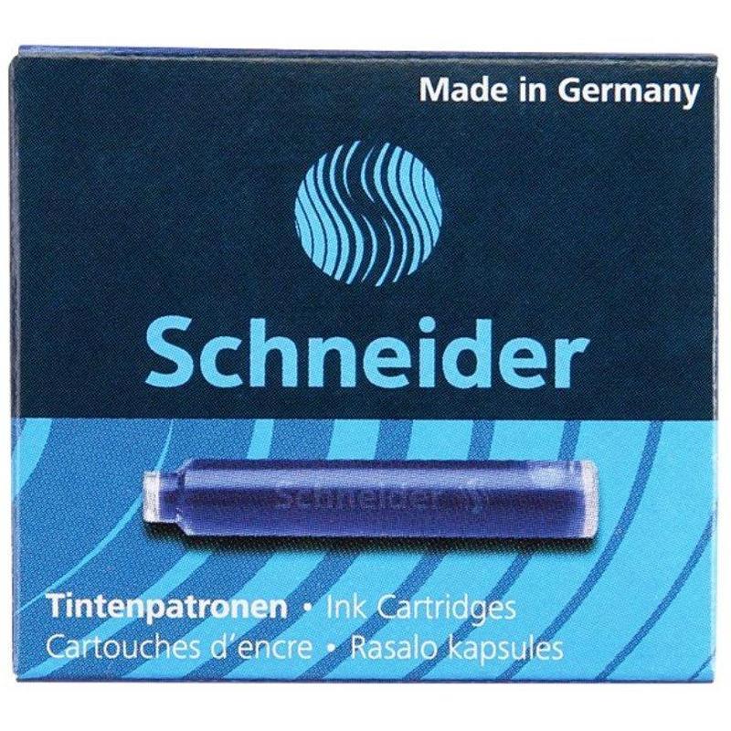 Комплект сменных чернильных патронов Schneider для перьевых ручек, 6 штук в картонной упаковке. Каждый патрон (картридж) длиной 4 см содержит чернила синего цвета.
