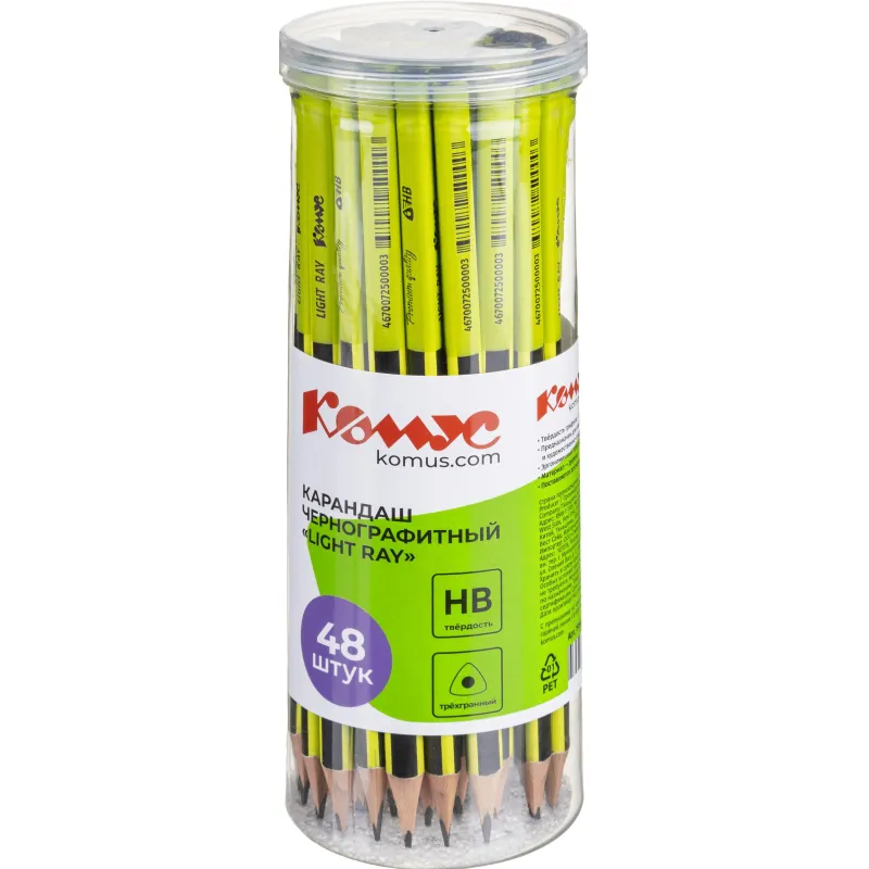 Карандаш чернографитный деревянный HB Комус заточенный трехгранный. Карандаш чернографитный Комус Light Ray первый помощник для выполнения проектно-конструкторских работ, позволяет сделать легкий набросок, быстрый стремительный рисунок или нарисовать полноценную картину. Карандаш выполнен в трехгранном корпусе из дерева. Многослойное лаковое покрытие с шелковистым эффектом. Карандаши поставляются заточенными, без ластика. Твердость грифеля — HB. Легко затачивается.