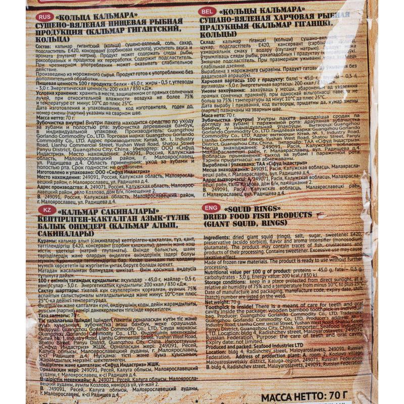 Кольца кальмара Сухогруз сушеные 70 г. Продукт готов к употреблению.