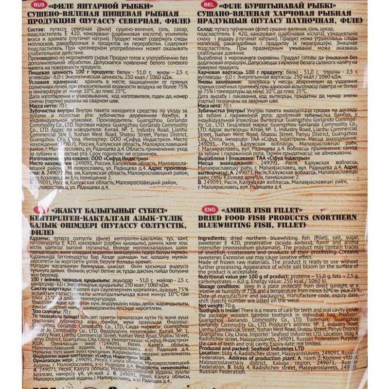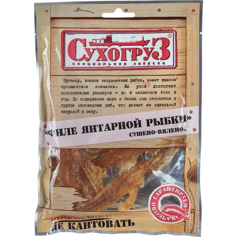 Рыбка янтарная Сухогруз филе 70 г. По содержанию жира и белка она относится к группе маложирных рыб, что делает ее идеальной закуской к пиву и полезной для людей, следящих за здоровьем. Продукт готов к употреблению.