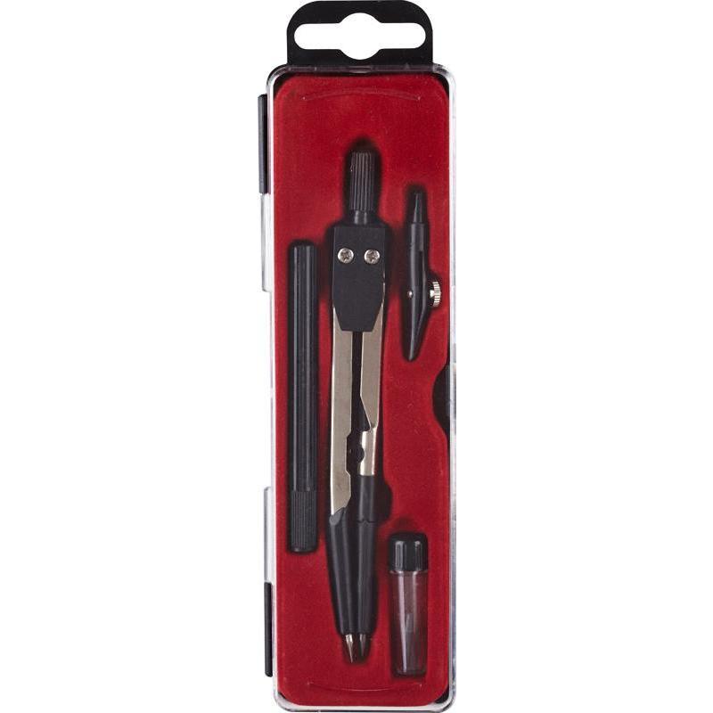 Набор чертежных пренадлежностей из 4-х предметов: циркуль из металлического сплава с резиновыми ножками ( длина 120 мм),запасной грифель, рейсфедерсная вставка, ручка для рейсфедера.На европодвесе,что позволяет эффективно расположить товар.Одним из важнейших характеристик является качество крепления подвижных частей циркуля — фиксирующий болт.Предназначен для школьников средних и старших классов.Циркуль комплектуется ударопрочным футляром, что исключает повреждение во время транспортировки, а такжесохраняет циркуль исправным продолжительное время.
