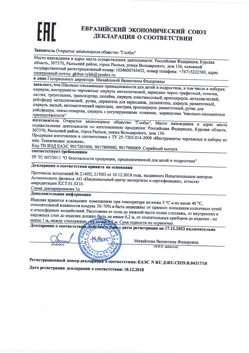 Готовальня «Глобус» (набор для черчения) состоит из девяти предметов — циркуль стальной никелированный (125 мм), пенал с запасным грифелем, карандаш черно-графитный деревянный, ластик резиновый, точилка пластмассовая, треугольник 30 градусов пластмассовый, треугольник 45 градусов пластмассовый, транспортир пластмассовый, линейка пластмассовая. Принадлежности упакованы в черный пластиковый пенал с прозрачной крышкой и подвесом. Набор предназначен для школьников средних и старших классов.