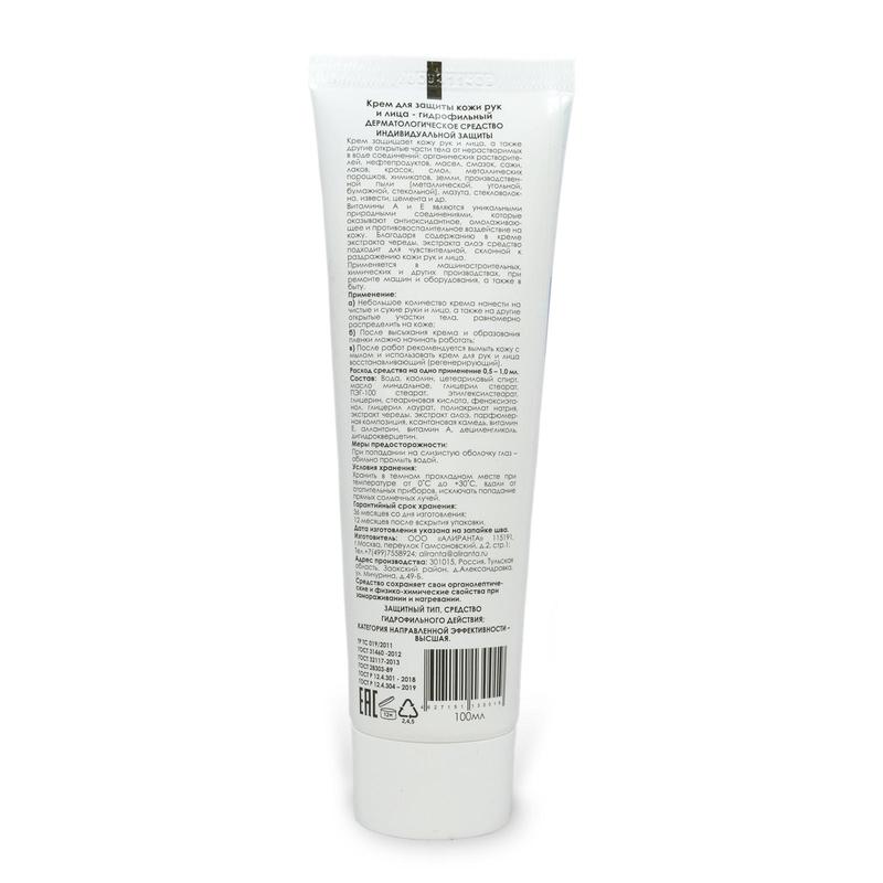 Крем защитный гидрофильный 100мл Алиранта.Назначение: крем защищает кожу рук и лица, а также другие открытые части тела от нерастворимых в воде соединений: органических растворителей, нефтепродуктов, масел, смазок, сажи, лаков, красок, смол, металлических порошков, химикатов, смол, земли, производственной пыли ( металлической, угольной, бумажной, стекольной), мазута, стекловолокна, извести, цемента и др. Область применения: применяется в машиностроительных, химических и других производствах, при ремонте машин и оборудования, а также в быту.Свойства: защищает кожу в течение 4-х часов и более. Облегчает очистку кожи после работы. Быстро впитывается и не оставляет жирных следов и ощущения липкости. Витамины А и Е являются уникальными природными соединениями, которые оказывают антиоксидантное, омолаживающее и противовоспалительное воздействие на кожу. Благодаря содержанию в креме экстракта череды, экстракта алоэ средство подходит для чувствительной и раздраженной кожи рук и лица.Рекомендации по применению:1. небольшое количество крема нанести на чистые и сухие руки и лицо, а также на другие открытые участки тела, равномерно распределить на коже;2. после высыхания крема и образования пленки можно начинать работать;3. по окончании работ вымыть кожу с мылом;4. после работ рекомендуется использовать крем для кожи рук и лица восстанавливающий (регенерирующий).Расход средства на одно применение 0.5-1мл.Меры предосторожности: при попадании на слизистую оболочку глаз - обильно промыть водой.Упаковка: пластиковые тубы 100 мл.Условия хранения: хранить в темном прохладном месте при температуре от 0 до +30°С.Гарантийный срок хранения: 36 месяцев со дня изготовления, 12 месяцев после вскрытия упаковки.Объем - 100 мл.Соответствует стандартам ГОСТ 31460-2012, ГОСТ Р 12.4.301-2018, ТР ТС 019/2011.