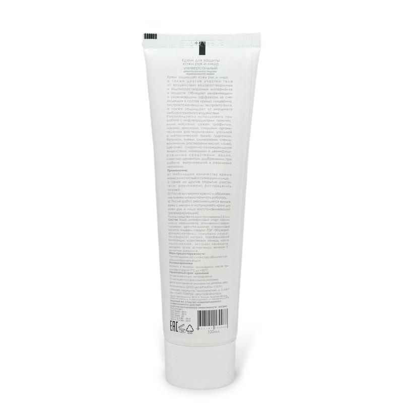 Крем Алиранта защитный универсальный 100 мл.Назначение: крем защищает кожу рук и лица, а также другие участки тела от воздействия водорастворимых и водонерастворимых материалов и веществ. Область применения: рекомендуется использовать при работе с нефтепродуктами, техническими маслами, сажей, графитом, лаками, красками, смолами, органическими растворителями, угольной и металлической пылью, гудроном, битумом, клеем, силиконами, стекловолокнами, растворами кислот, солей, щелочей, смазочно-охлаждающими жидкостями, моющими и дезинфицирующими средствами, водой, известью, цементом, удобрениями, при работе, выполняемой в резиновых перчатках.Свойства: крем обладает универсальной защитой благодаря содержанию как гидрофобных, так и гидрофильных компонентов. Быстро впитывается, не оставляет ощущения липкости. Обладает увлажняющим и ухаживающим эффектом за счет входящих в состав крема глицерина, экстракта календулы, экстракта алоэ, а также защищает от внешнего неблагоприятного воздействия. Витамины А и Е являются уникальными природными соединениями, которые оказывают антиоксидантное, омолаживающее и противовоспалительное воздействие на кожу. Подходит для использования людям с чувствительной кожей. Не вызывает аллергические реакции.Рекомендации по применению:1. небольшое количество крема нанести на чистые и сухие руки и лицо, а также на другие открытые участки тела, равномерно распределить на коже;2. после высыхания крема и образования пленки можно начинать работать;3. по окончании работ вымыть кожу с мылом;4. после работ рекомендуется использовать крем для кожи рук и лица восстанавливающий (регенерирующий).Расход средства на одно применение 0,5-1мл.Меры предосторожности: При попадании на слизистую оболочку глаз - обильно промыть водой.Упаковка: пластиковые тубы 100 мл.Условия хранения: хранить в темном прохладном месте при температуре от 0 до +30°С.Гарантийный срок хранения: 36 месяцев со дня изготовления, 6 месяцев после вскрытия упаковки.Соответствует стандартам ГОСТ 31460-2012, ГОСТ Р 12.4.301-2018, ТР ТС 019/2011.