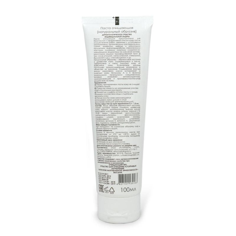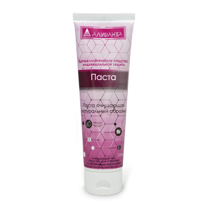 Паста очищающая Алиранта для рук и лица с натуральным абразивом 100 мл.Назначение: паста очищающая предназначена для очистки кожи от сильных промышленных и бытовых загрязнений (масел, смазок, сажи, красок, лаков, смол, клеев, битума, мазута, силиконов, пыли, графита, нефтепродуктов, жира, цемента, извести и т.д.). Входящая в состав пасты абрикосовая косточка, способствует эффективной и бережной очистке кожи. Область применения: паста очищающая применяется в промышленности, связанных с применением смазок, жира, масел, графита, смол, металлической пыли, после работ с землей, а также в быту.Свойства: натуральные абразивы - абрикосовая косточка и древесная мука, содержащиеся в пасте, эффективно и мягко очищают кожу от въевшейся грязи. Ксантановая камедь облегчает удаление трудносмываемых загрязнений. Содержание в составе пасты кокосового масла питает кожу, смягчает, увлажняет и восстанавливает, препятствует возникновению трещинок, шелушений и раздражений. Аллантоин способствует заживления поврежденных тканей кожи. Витамины А и Е являются уникальными природными соединениями, которые оказывают антиоксидантное, омолаживающее и противовоспалительное воздействие на кожу.Рекомендации по применению:1. перед применением пасты руки не следует смачивать водой;2. средство нанести на загрязненные руки и тщательно растереть;3. полностью смывать остатки пасты с грязью большим количеством воды и тщательно высушить руки;4. после очистки кожи рекомендуется использовать крем для кожи рук и лица восстанавливающий (регенерирующий).Расход средства на одно применение 0,5-1мл.Объем - 100 мл.Меры предосторожности: при попадании на слизистую оболочку глаз - обильно промыть водой.Условия хранения: хранить в темном прохладном месте при температуре от 0 до +30°С.Гарантийный срок хранения: 36 месяцев со дня изготовления, 12 месяцев после вскрытия упаковки.Соответствует стандартам ГОСТ 31696-2012, ГОСТ Р 12.4.301-2018, ТР ТС 019/2011.