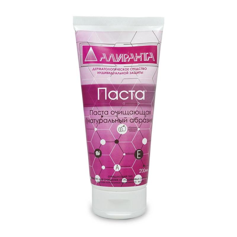 Паста очищающая Алиранта для рук и лица с натуральным абразивом 200 мл. Очищает кожу от сильных промышленных и бытовых загрязнений (масел, смазок, сажи, красок, лаков, смол, клеев, битума, мазута, силиконов, пыли, графита, нефтепродуктов, жира, цемента, извести и т.д.). Входящая в состав пасты абрикосовая косточка, способствует эффективной и бережной очистке кожи. Натуральные абразивы - абрикосовая косточка и древесная мука, содержащиеся в пасте, эффективно и мягко очищают кожу от въевшейся грязи. Ксантановая камедь облегчает удаление трудносмываемых загрязнений. Содержание в составе пасты кокосового масла питает, смягчает, увлажняет и восстанавливает кожу, препятствует возникновению трещинок, шелушений и раздражений. Аллантоин способствует заживлению поврежденных тканей. Витамины А и Е являются уникальными природными соединениями, которые оказывают антиоксидантное, омолаживающее и противовоспалительное воздействие на кожу.Объем - 200 мл.Соответствует стандартам ГОСТ 31696-2012, ГОСТ Р 12.4.301-2018, ТР ТС 019/2011.