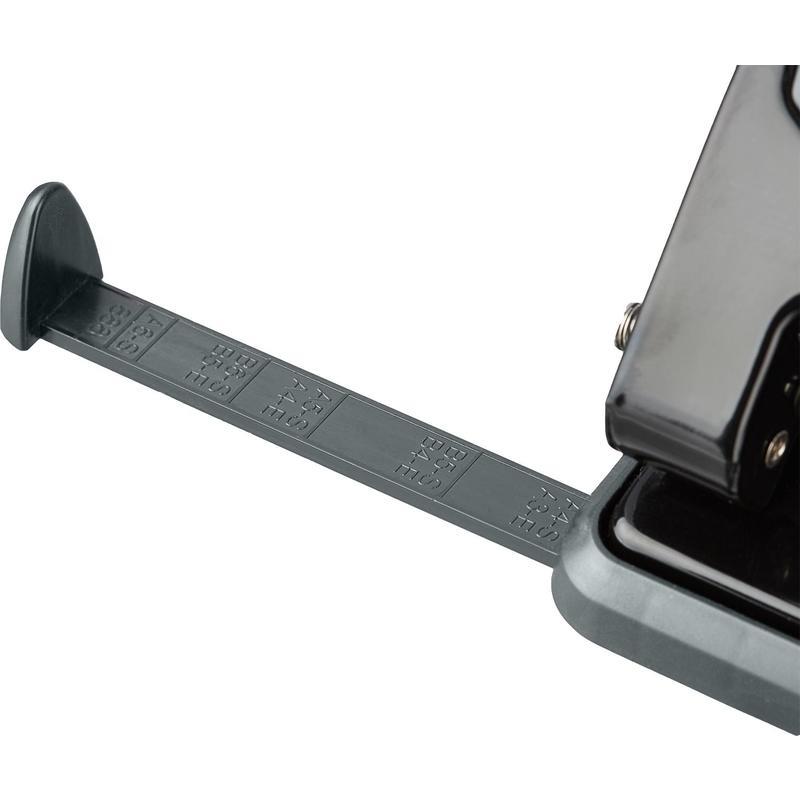 Перед началом использования необходимо снять фиксацию дырокола в сложенном виде. Для этого нужно одновременно нажать на металлическую кнопку возле основания дырокола и верхнюю часть дырокола. Точно также можно зафиксировать дырокол обратно в закрытое положение для экономии рабочего пространства и удобной перевозки. Наличие линейки A3, A4, A5, A6, B4, B5, B6 позволяет зафиксировать бумагу на нужном расстоянии, отметка на линейке 888 позволяет использовать вместо дырокола на 4 отверстия. Дырокол выполнен в металлическом черном корпусе с противоскользящей прорезиненной вставкой.
