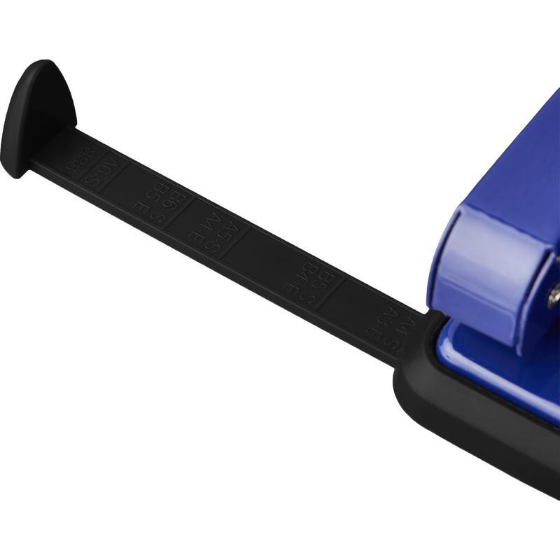 Перед началом использования необходимо снять фиксацию дырокола в сложенном виде. Для этого нужно одновременно нажать на металлическую кнопку возле основания дырокола и верхнюю часть дырокола. Точно также можно зафиксировать дырокол обратно в закрытое положение для экономии рабочего пространства и удобной перевозки. Наличие линейки A3, A4, A5, A6, B4, B5, B6 позволяет зафиксировать бумагу на нужном расстоянии, отметка на линейке 888 позволяет использовать вместо дырокола на 4 отверстия. Дырокол выполнен в металлическом синем корпусе с противоскользящей прорезиненной вставкой черного цвета.