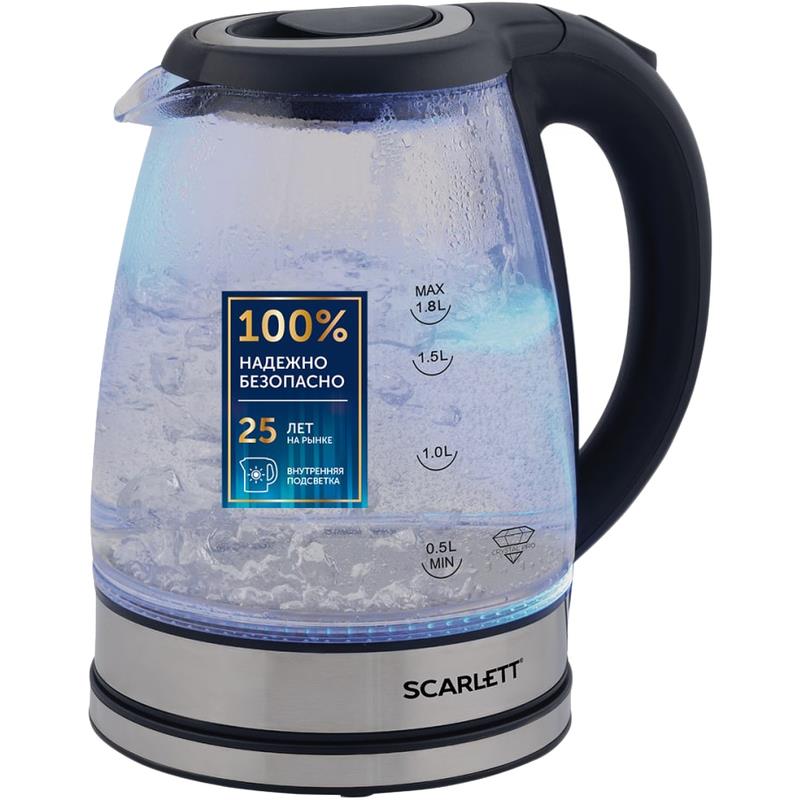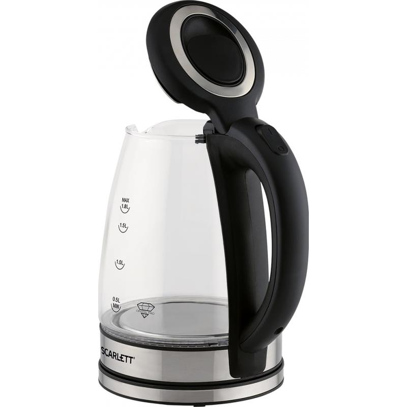 Электрический чайник SC-EK27G88 объемом 1.8 л оснащен традиционной системой открытия крышки. Эргономичная ручка, закрытый нагревательный элемент сделают эксплуатацию прибора еще проще и комфортнее. Внутренняя подсветка позволит наблюдать за завораживающим процессом кипячения. Классический черный цвет корпуса в сочетании с металлической декорацией позволит прибору вписаться в любой интерьер кухни.