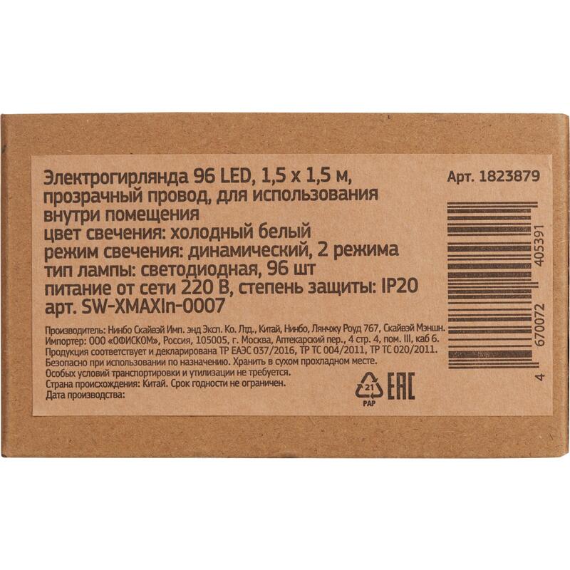 Светодиодная гирлянда Бахрома для использования внутри помещений. Незаменимый аксессуар для создания новогоднего настроения, а также любого декора и атмосферы, как праздничной, так и романтической. Выполнена в виде бахромы - прямая линия с нисходящими линиями светодиодных лампочек. Безопасна при использовании как на новогодней ели, так и мебели, шторах и т .д. Количество лампочек: 96. Цвет лампочек: холодный белый. Длина: 1,5х1,5 м. Провод: прозрачный. Режим свечения: вспышка. Степень защиты: IP20. Тип питания: батарейка и подключение к сети. Соединяемость: нет.