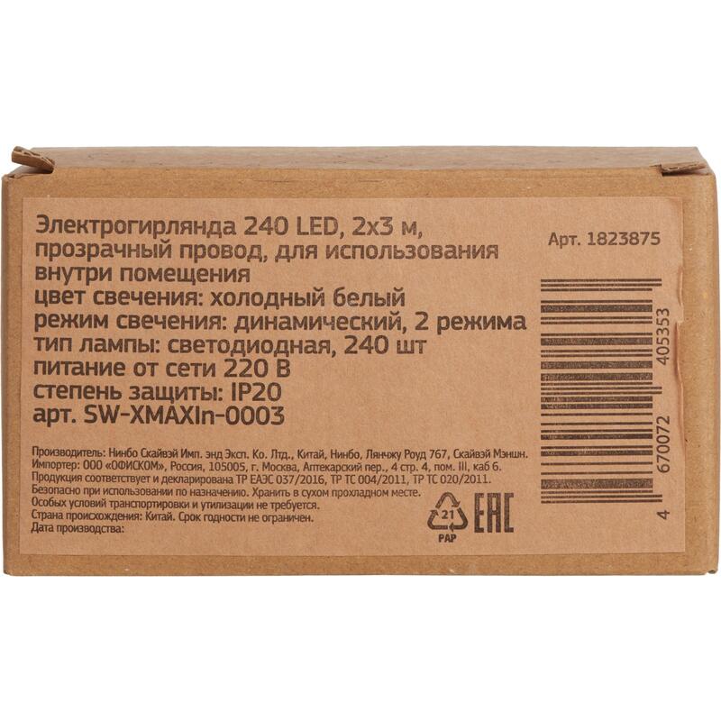 Светодиодная гирлянда Бахрома для использования внутри помещений. Незаменимый аксессуар для создания новогоднего настроения, а также любого декора и атмосферы, как праздничной, так и романтической. Выполнена в виде бахромы - прямая линия с нисходящими линиями светодиодных лампочек. Безопасна при использовании как на новогодней ели, так и мебели, шторах и т .д. Количество лампочек: 240. Цвет лампочек: холодный белый. Длина: 2х3 м. Провод: прозрачный. Режим свечения: вспышка. Степень защиты: IP20. Тип питания: батарейка и подключение к сети. Соединяемость: нет.
