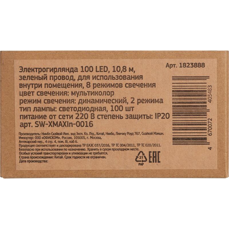 Светодиодная гирлянда для использования внутри помещений. Незаменимый аксессуар для создания новогоднего настроения, а также любого декора и атмосферы, как праздничной, так и романтической. Выполнена в классическом виде - прямая линия со светодиодными лампочками. Безопасна при использовании как на новогодней ели, так и мебели, шторах и т .д. Количество лампочек: 100. Цвет лампочек: разноцветная - 8 цветов. Длина: 10,8 м. 8 режимов свечения: вспышка, волна, затухание, мерцание, смена цвета, переливы, хамелеон. Степень защиты: IP20. Тип питания: батарейка и подключение к сети. Соединяемость: нет.
