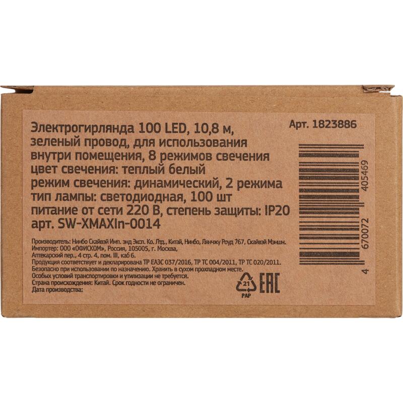 Светодиодная гирлянда для использования внутри помещений. Незаменимый аксессуар для создания новогоднего настроения, а также любого декора и атмосферы, как праздничной, так и романтической. Выполнена в классическом виде - прямая линия со светодиодными лампочками. Безопасна при использовании как на новогодней ели, так и мебели, шторах и т .д. Количество лампочек: 100. Цвет лампочек: теплый белый. Длина: 10,8 м. 8 режимов свечения: вспышка, волна, затухание, мерцание, смена цвета, переливы, хамелеон. Степень защиты: IP20. Тип питания: батарейка и подключение к сети. Соединяемость: нет.