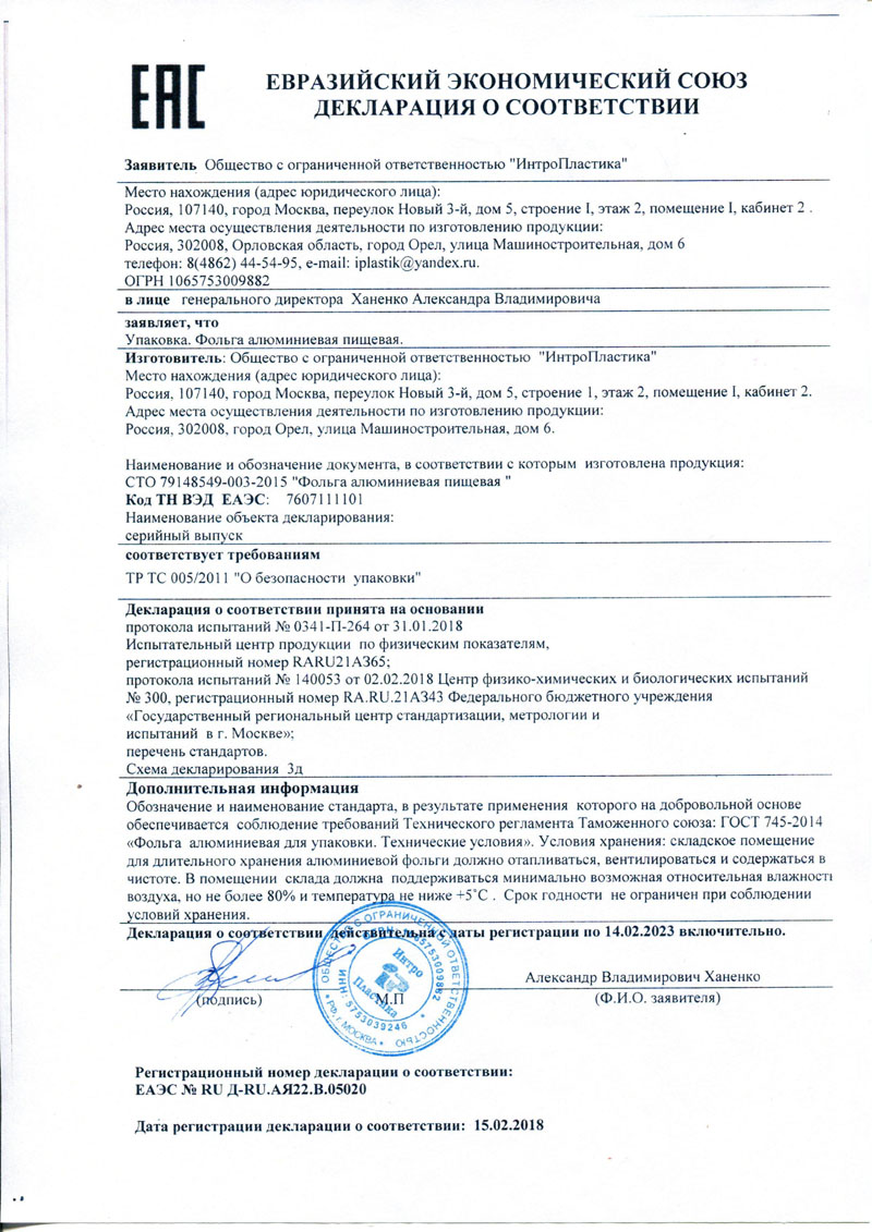 Пищевая фольга является удобным материалом для запекания и хранения продуктов: обладает прочностью, жаростойкостью, непроницаема для влаги и жира, сохраняет свежесть и качество продуктов в течение длительного времени, а также не накапливает посторонние запахи и пыль. Фольга является разлагаемым материалом, который легко утилизируется (например, закапыванием в почву). Продается в рулоне шириной 30 см, общая длина рулона — 10 м. Плотность — 11 мкм.