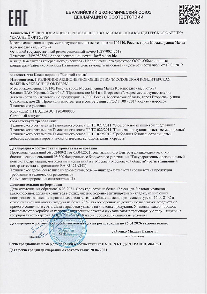 Какао-порошок «Золотой ярлык» — сочетание традиционного вкуса и высокого качества. Не содержит искусственных компонентов, богат полезными веществами. Какао подходит как для приготовления напитка, так и для кулинарных целей. 100 г продукта упакованы в картонную коробку.Пищевая ценность 100г продукта, г: белки — 24,0; жиры — 15,0; углеводы — 10,0; пищевые волокна — 35,3; органические кислоты — 3,9Энергетическая ценность — 1470 кДж (350 ккал)/100 г.Срок годности: 12 месяцевУсловия хранения: Хранить какао при температуре от 15 до 21ºС и относительной влажности воздуха не более 75%. Не подвергать воздействию прямого солнечного света.Производитель: ОАО «Красный ОктябрЬ»