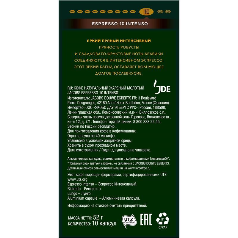 Капсулы для кофемашин типа Nespresso Jacobs Espresso Intenso — кофе, обладающий богатым бархатистым вкусом с ореховыми нотками, сохраняющим долгое изысканное послевкусие.