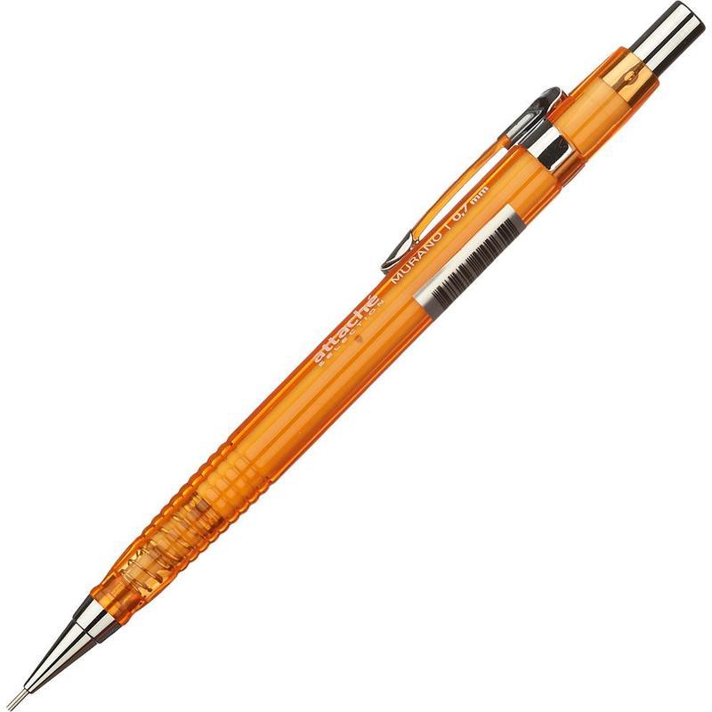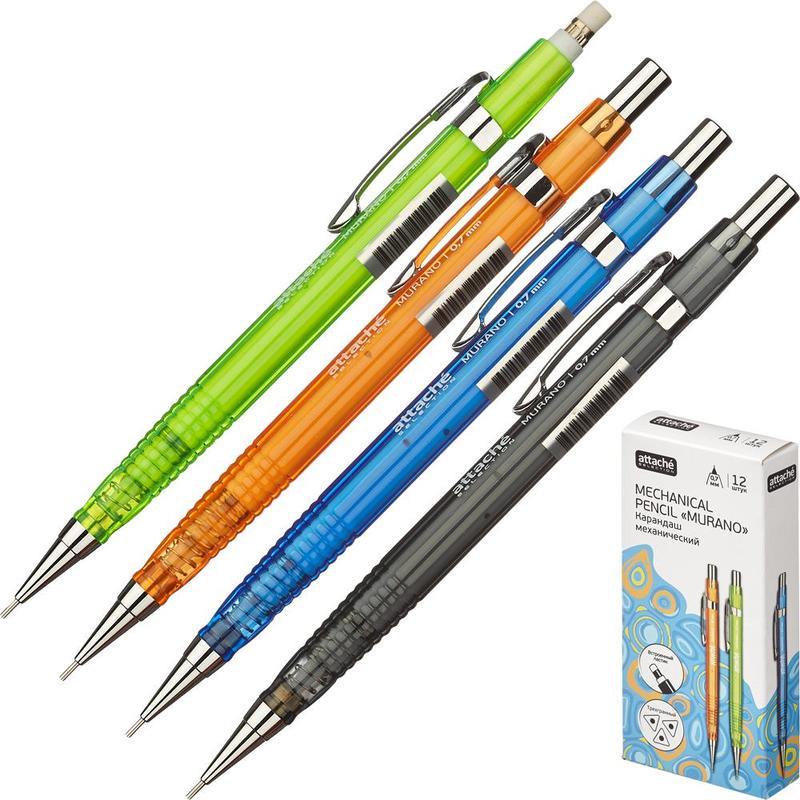 Карандаш механический Attache Selection Murano с толщиной линии письма 0,7 мм. Выполнен в прозрачном тонированном пластиковом корпусе, цвет корпуса — в ассортименте. Карандаш механический обладает металлическим наконечником, клипом и ластиком. Предназначен для рисования, черчения и письма. Сменный стержень для механического карандаша вы сможете найти во вкладке «Расходные материалы». Товар поставляется в нескольких вариантах цвета/дизайна (без возможности выбора).