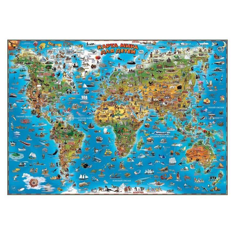 Настенная карта мира для детей. Формат — 137x97 см. Карта отпечатана на мелованной бумаге и покрыта тонкой антибликовой пленкой со стороны изображения. Карта содержит множество потрясающих иллюстраций, которые познакомят ребенка с флорой и фауной всего мира, достопримечательностями разных стран, местными обычаями, традициями и играми. Изучая карту, ребенок узнает, где живут ламы, в каких странах танцуют самбу и увлекаются бирлингом. Карта познакомит детей с известными путешественниками, с географическими открытиями, историей авиации и мореходства.