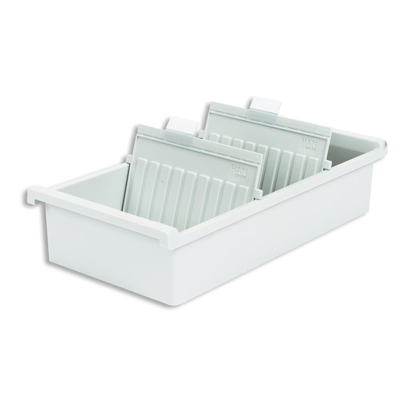 Открытая горизонтальная картотека Han формата А6 изготовлена из пластика светло-серого цвета, размеры — 347×171×76 мм. Предназначена для удобного хранения и систематизации карточек и документов, например, трудовых книжек. Вмещает до 1300 картонных карточек (в комплект не входят). Картотека поставляется с двумя пластиковыми разделителями и двумя прозрачными индексными окнами. Всего можно установить до 26 разделителей (приобретаются отдельно).
