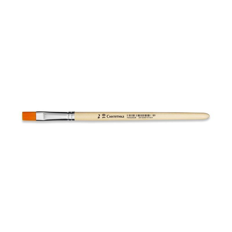 Кисть синтетика плоская № 10. Идентична натуральному колонку по параметрам жёсткости и эластичности. Упругость волоса даже выше, чем у колонка. Однако синтетика уступает колонковым по наполнению кистью водой и объему впитываемой краски. Синтетическими кисточками можно рисовать чёткие и ровные линии. Синтетический волос имеет капиллярный эффект, что позволяет использовать такие кисти даже в акварели. Кисть имеет короткую (18 см), деревянную ручку. Кисть предназначена для работы акварелью. Поставляется в полипропиленовом пакете.