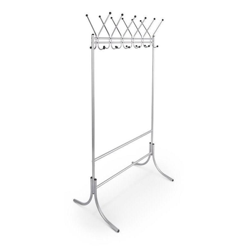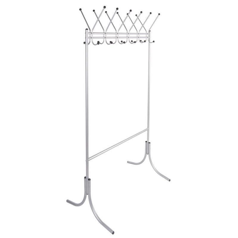 Вешалка выполнена из круглой трубы диаметром 25и и 16 мм. Крючки выполнены из круглой трубы диаметром 10 мм. Кол-во крючков: 12 Покрытие: порошковая покраска Цвет: металлик Преимущества: 1. Компактность в собранном виде 2. Крепление ножек на стяжках (не используются саморезы), что продлевает срок службы изделия 3. Наличие нижней планки для складных зонтов (мокрые зонты находятся ниже одежды, сохраняя ее от влаги).