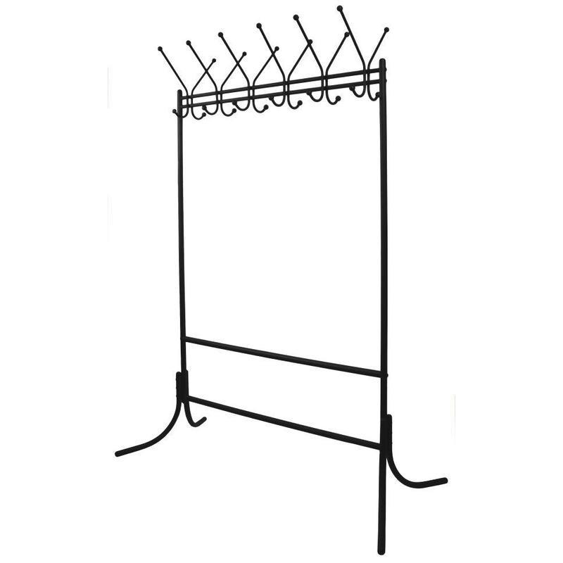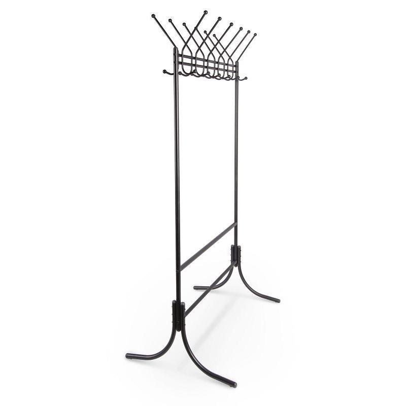 Вешалка выполнена из круглой трубы диаметром 25и и 16 мм. Крючки выполнены из круглой трубы диаметром 10 мм. Кол-во крючков: 12 Покрытие: порошковая покраска Цвет: черный Преимущества: 1. Компактность в собранном виде 2. Крепление ножек на стяжках (не используются саморезы), что продлевает срок службы изделия 3. Наличие нижней планки для складных зонтов (мокрые зонты находятся ниже одежды, сохраняя ее от влаги).