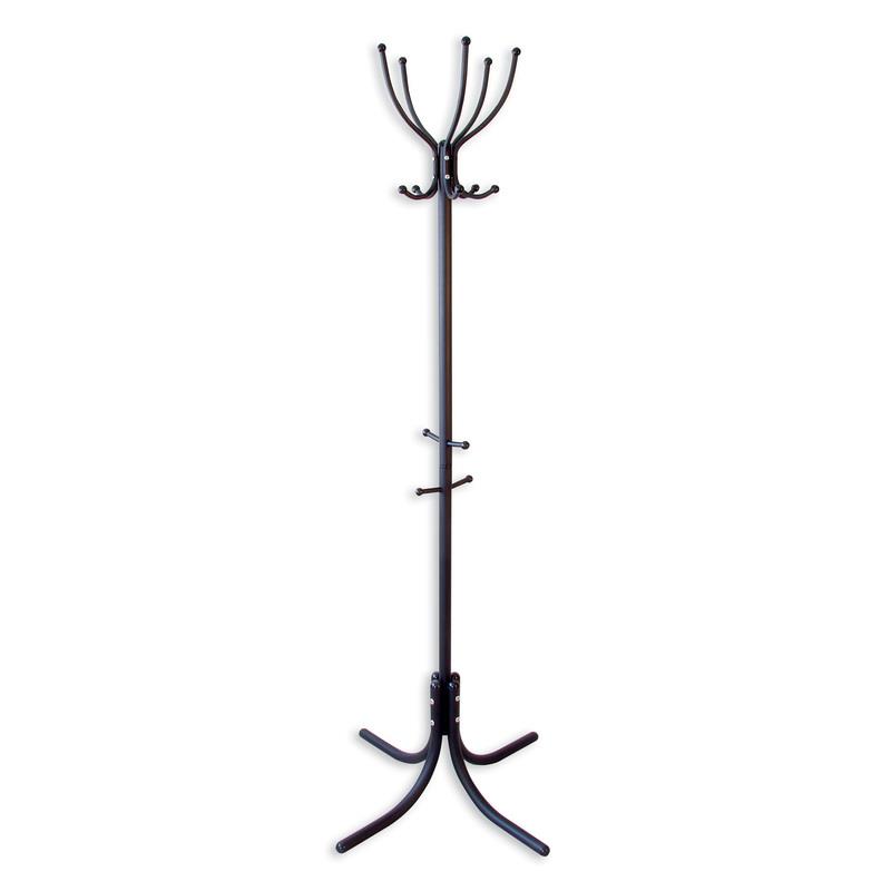 Напольная вешалка высотой 178 см выполнена из металла с покрытием черного цвета. Размер основания — 70?70 см. Не занимает много места, подходит для дома и офиса. В верхней частиштанги-стойки расположены крючки и рожки для пяти предметов одежды и головных уборов. Также имеются четыре держателя для зонтов и сумок.Изображения товаров на сайте не могут гарантировать точную цветопередачу.