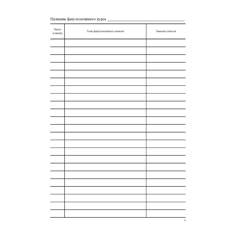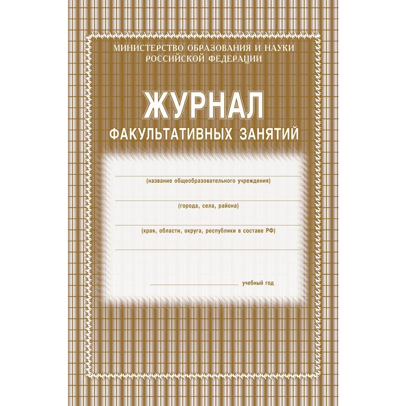 Журнал предназначен для учета работы факультативных групп и ведется в основных и средних общеобразовательных школах по каждому факультативу отдельно. Формат А4. Обложка выполнена в строгом стиле из мягкой цветной офсетной бумаги. Внутренний блок изготовлен из газетной бумаги, включает 48 страниц. Журнал построен по образцу классного журнала (ФИО ученика, колонки для отметок и т.д.).