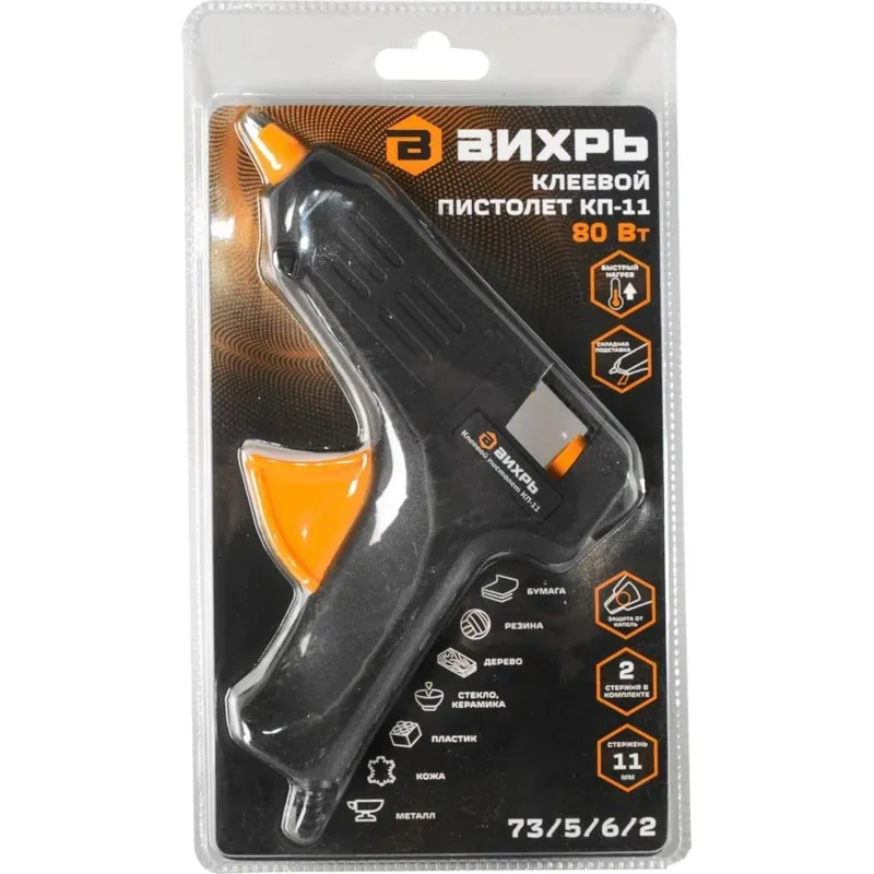 • Клеевой пистолет Вихрь КП-11 обеспечит надежную фиксацию таких поверхностей, как дерево, пластик, пенопласт, бумага, резина, полиуретан и других.