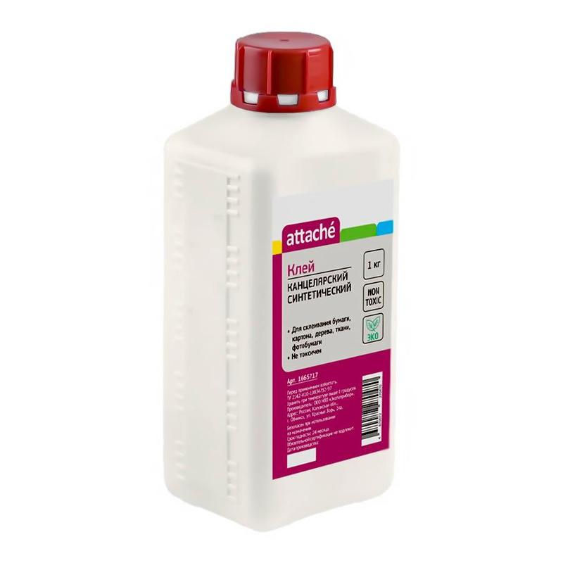 Синтетический канцелярский клей Attache 1 кг. Морозостойкий, прозрачный, высокого качества. Предназначен для офисных канцелярских работ по бумаге и картону, а также для приклеивания фотографий. Клей нетоксичен, не содержит растворителей. Способ применения: поверхность перед склеиванием должна быть сухой, без загрязнений. Клей равномерно нанести на склеиваемые поверхности, соединить и прижать. Соединение оставить в сжатом состоянии не менее двух часов. Максимальный эффект достигается путем плотного сжатия склеиваемых поверхностей до полного высыхания. Время полного высыхания — около 24 часов при температуре 20 °С и относительной влажности воздуха 65%.