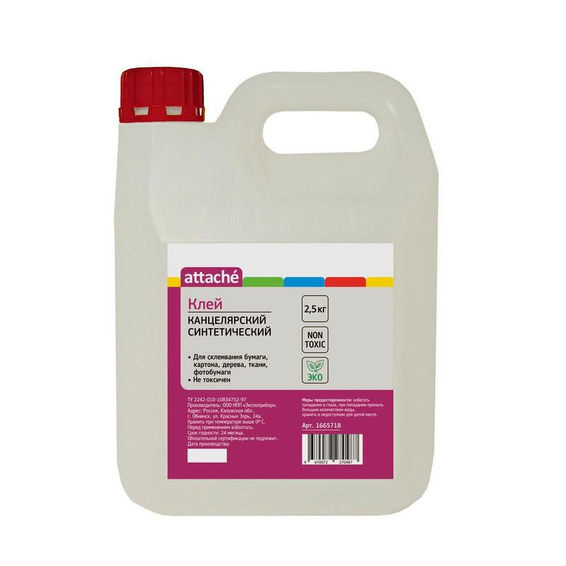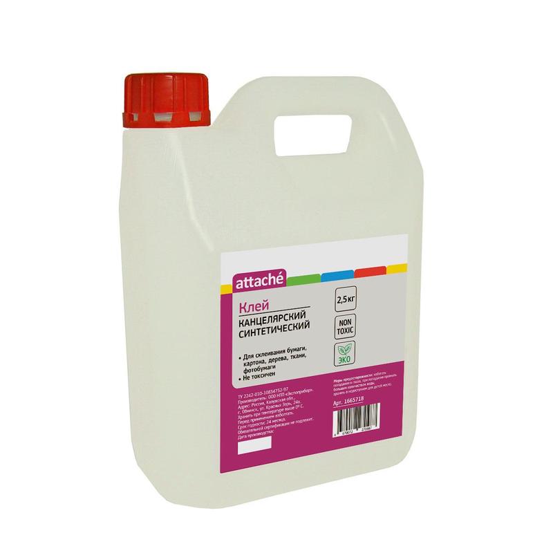 Синтетический канцелярский клей Attache 2,5 кг. Морозостойкий, прозрачный, высокого качества. Предназначен для офисных канцелярских работ по бумаге и картону, а также для приклеивания фотографий. Клей нетоксичен, не содержит растворителей. Способ применения: поверхность перед склеиванием должна быть сухой, без загрязнений. Клей равномерно нанести на склеиваемые поверхности, соединить и прижать. Соединение оставить в сжатом состоянии не менее двух часов. Максимальный эффект достигается путем плотного сжатия склеиваемых поверхностей до полного высыхания. Время полного высыхания — около 24 часов при температуре 20 °С и относительной влажности воздуха 65%.