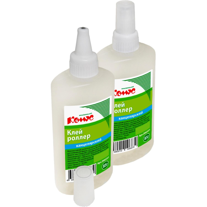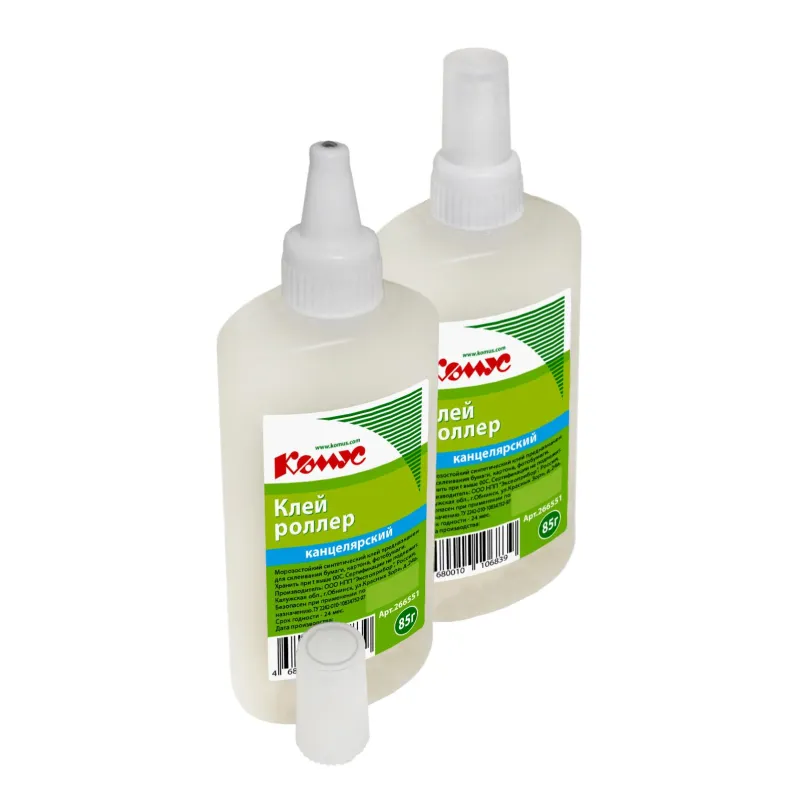 Канцелярский клей «Комус» с аппликатором-роллером (шарик из нержавеющей стали), который обеспечивает легкое и равномерное нанесение. Объем — 85 мл, бесцветный. Применяется для склеивания бумаги, картона, декоративных и поделочных работ. Съемный колпачок предохраняет клей от засыхания. Клей морозостойкий. Выдерживает 4 цикла заморозки/разморозки при температуре до −30°С (длительностью не более 15 суток). Клей имеет консистенцию — гель.
