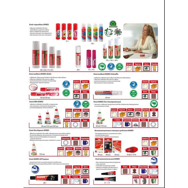 Клей-карандаш Kores Glue-Eco предназначен для склеивания бумаги, картона, фотографий и текстиля. Основа клея обладает мягкой структурой и содержит глицерин для легкого скольжения. Легко смывается водой и отстирывается, не имеет запаха. Простой и удобный механизм, расположенный в основании стержня, позволяет легко выкрутить и закрутить столбик клея. Вес - 10 г. Не содержит цветовых пигментов (бесцветный). Безопасен для детей. Характерной особенностью является возможное выделение глицериновых капель на поверхности данного клея, что придает легкость скольжения и возможность легкого нанесения клея на бумагу, тем самым обеспечивая экономичное расходование клея.