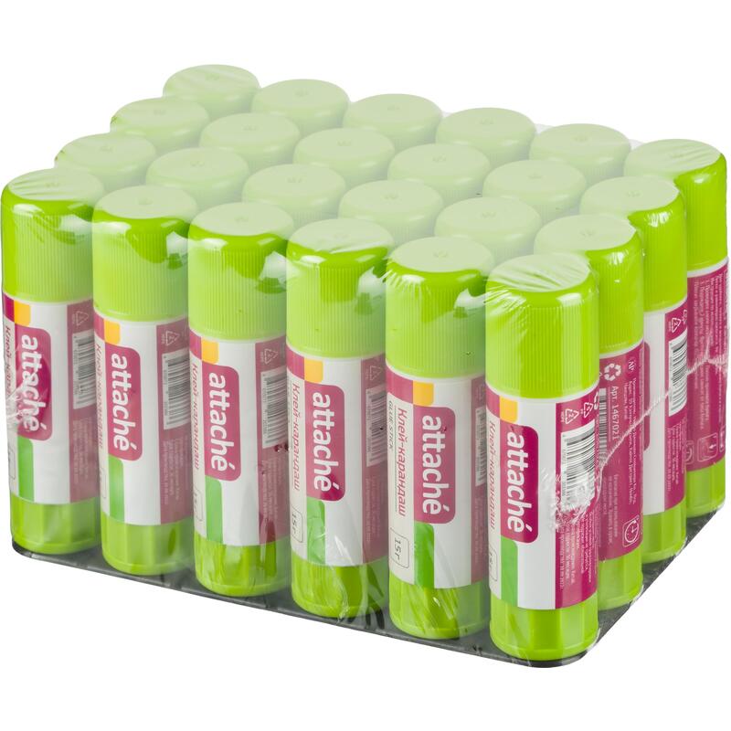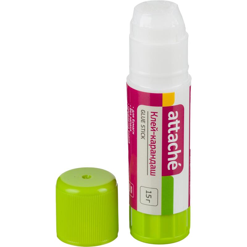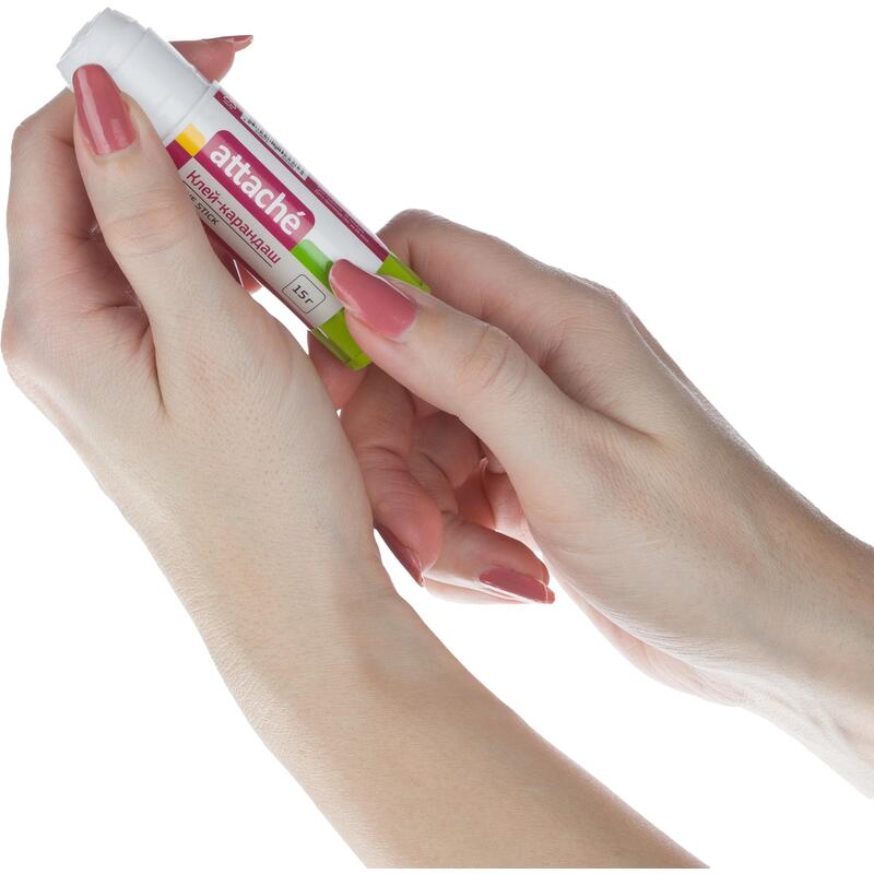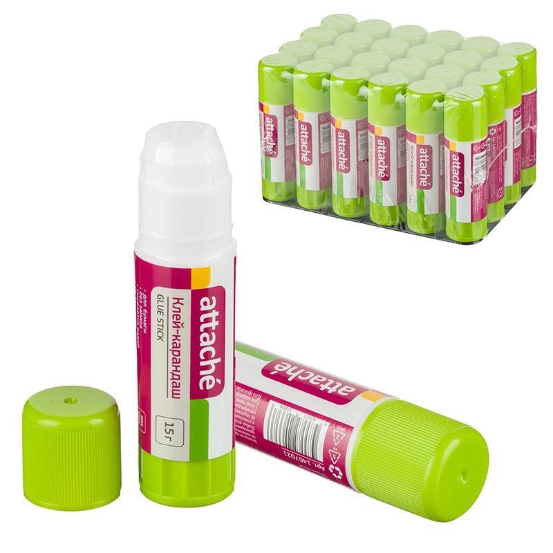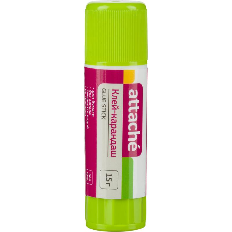 Клей-карандаш Attache предназначен для склеивания бумаги, картона. Основа клея содержит глицерин для легкого скольжения. Простой и удобный механизм, расположенный в основании стержня, позволяет легко выкрутить и закрутить столбик клея. Вес — 15 г. Форма корпуса: круглая. Не содержит цветовых пигментов (бесцветный).