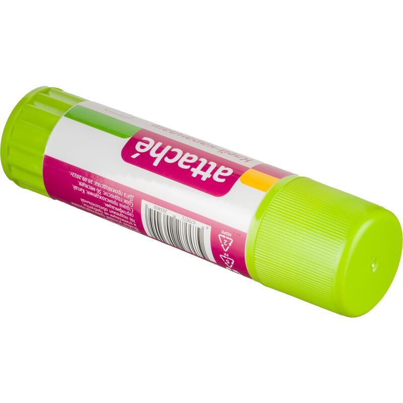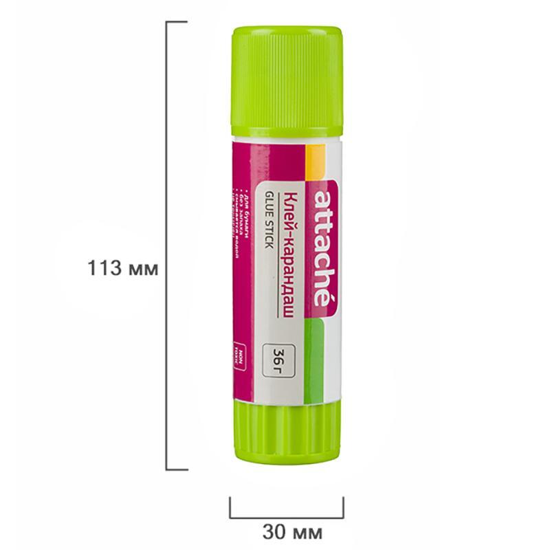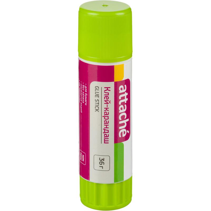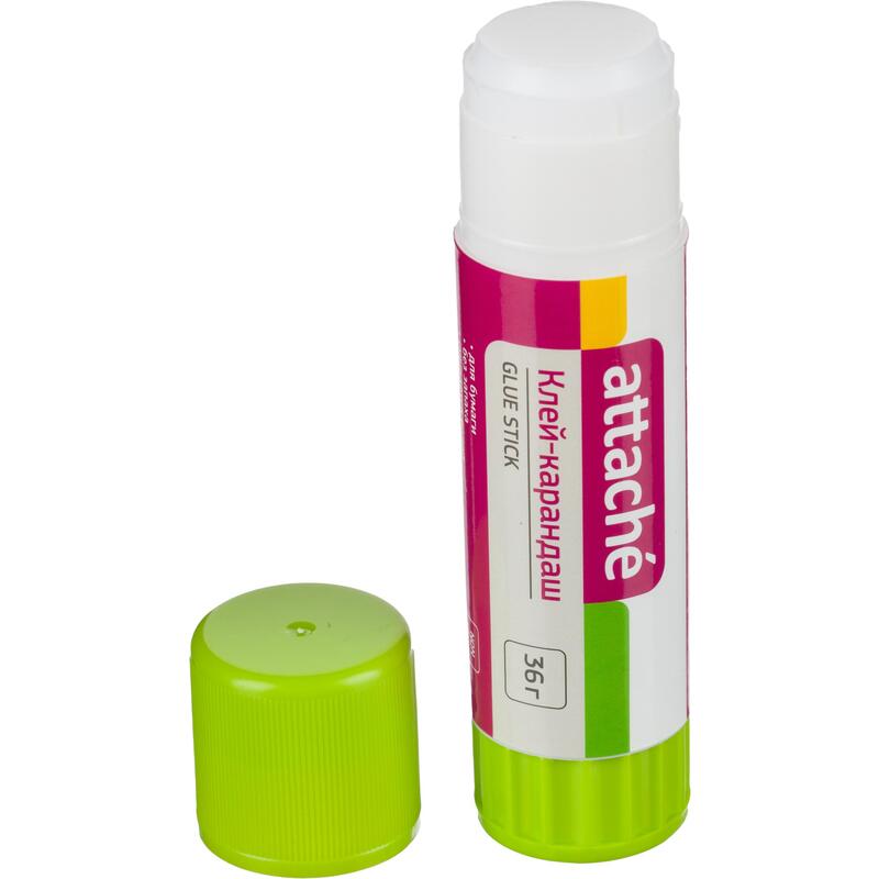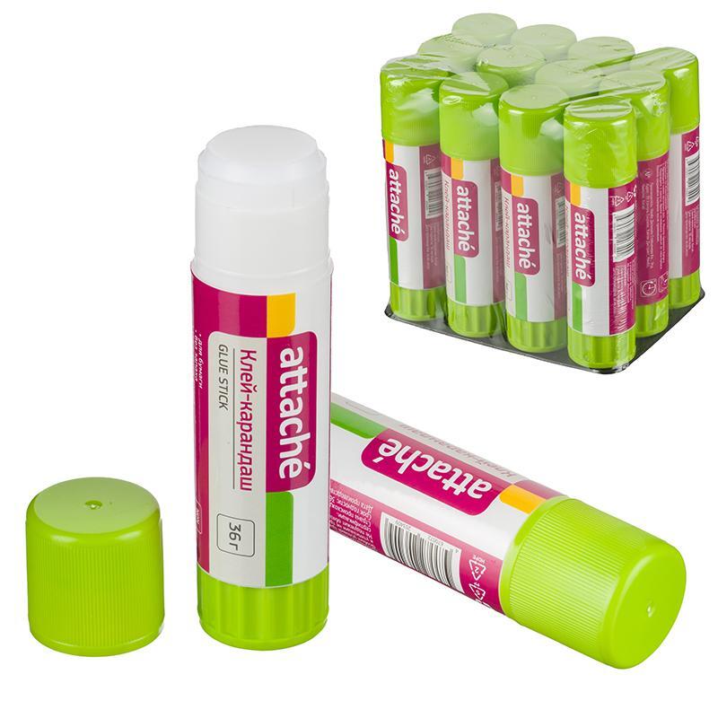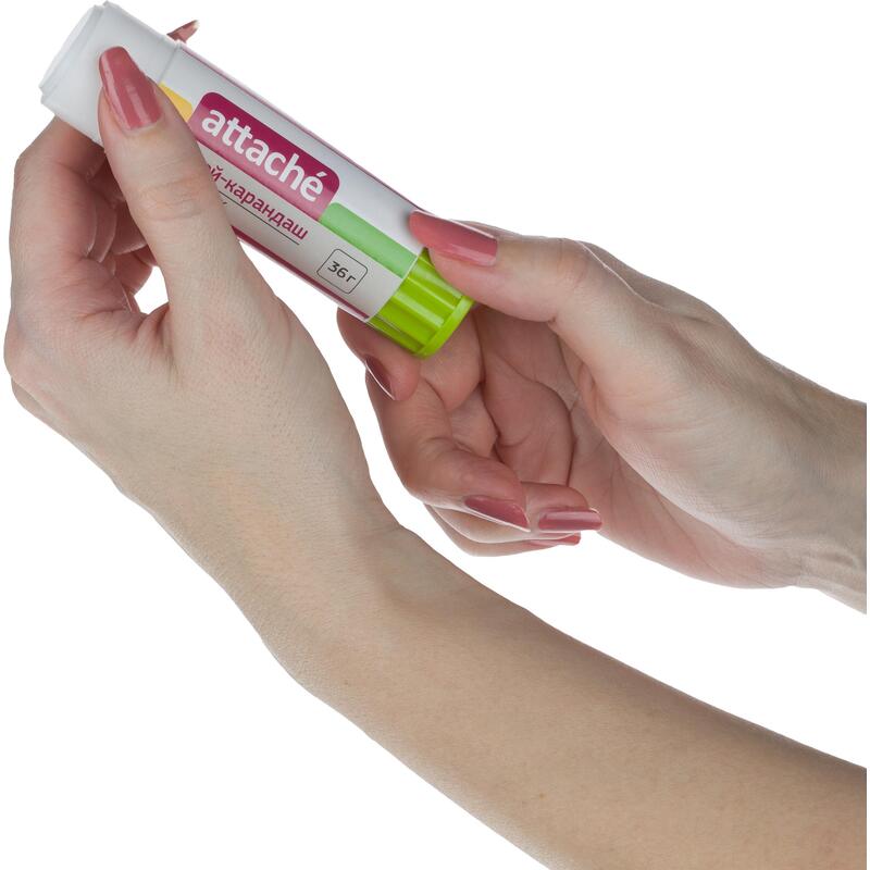 Клей-карандаш Attache предназначен для склеивания бумаги, картона. Основа клея содержит глицерин для легкого скольжения. Простой и удобный механизм, расположенный в основании стержня, позволяет легко выкрутить и закрутить столбик клея. Вес — 36 г. Форма корпуса: круглая. Не содержит цветовых пигментов (бесцветный).