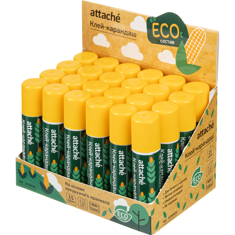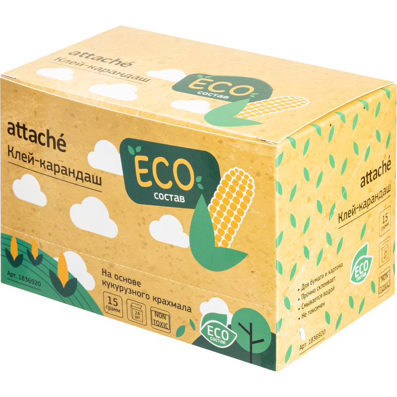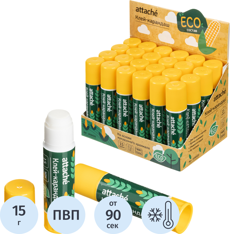 Клей-карандаш Attache предназначен для склеивания картона, бумаги, текстиля для бумаги. Вес — 15 г. Форма корпуса: круглая. Не содержит цветовых пигментов (бесцветный). Изготовлен из поливинилпирролидона.