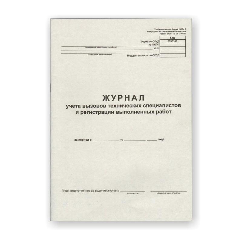Журнал вызова технических специалистов (формат А4). Обложка изготовлена из картона белого цвета. Внутренний блок — газетная бумага, 24 листа, крепится к обложке с помощью скрепок.